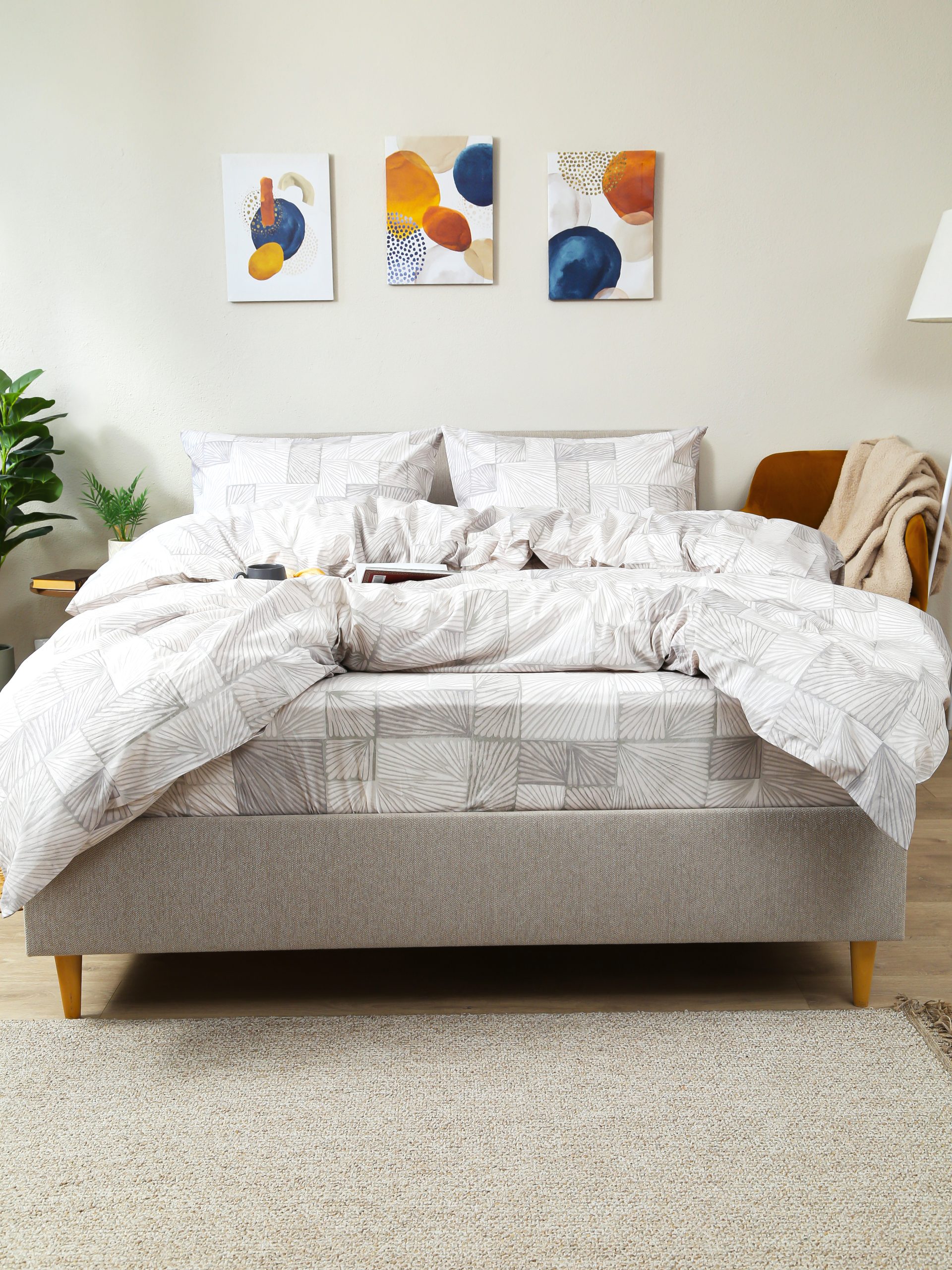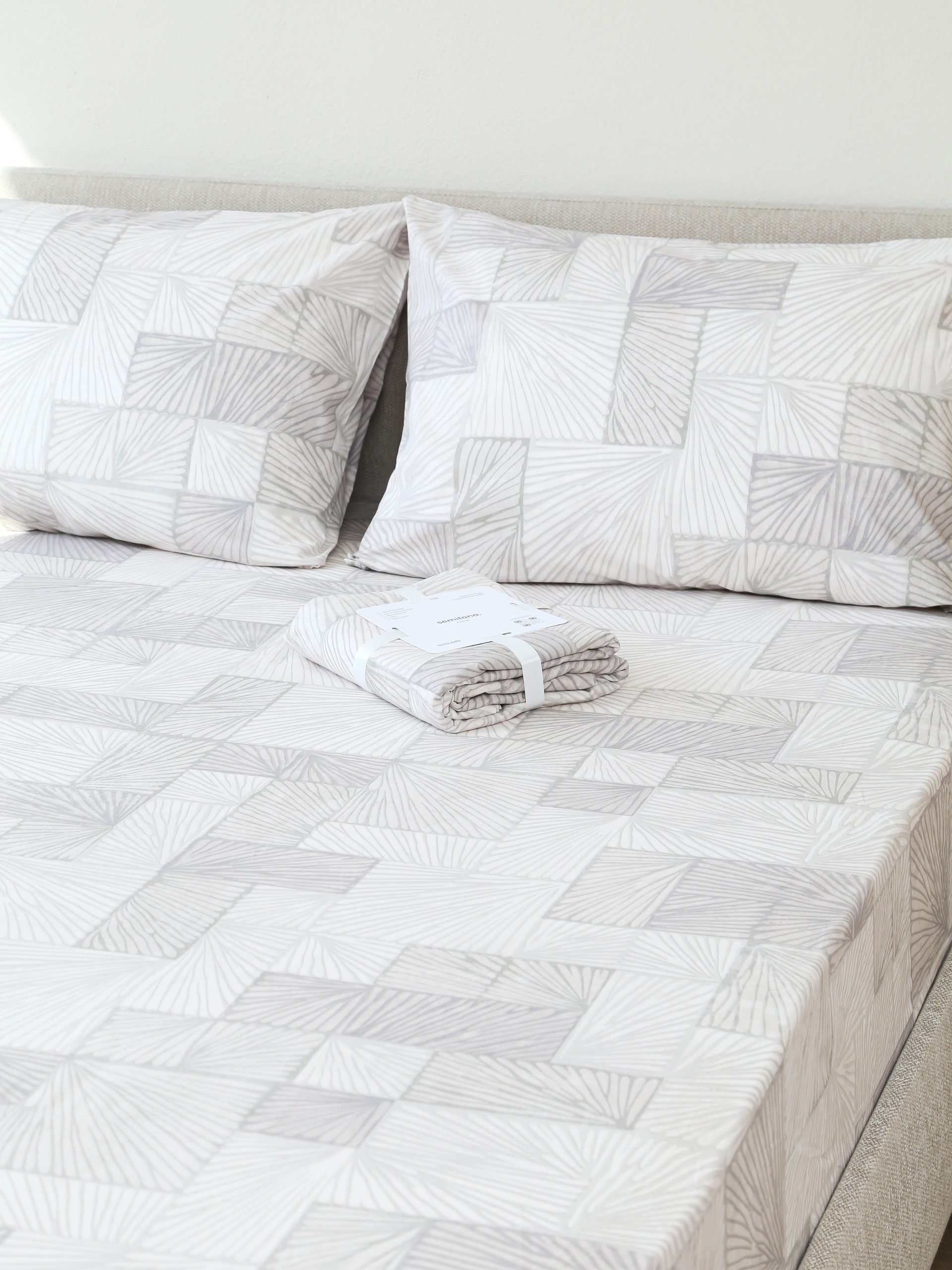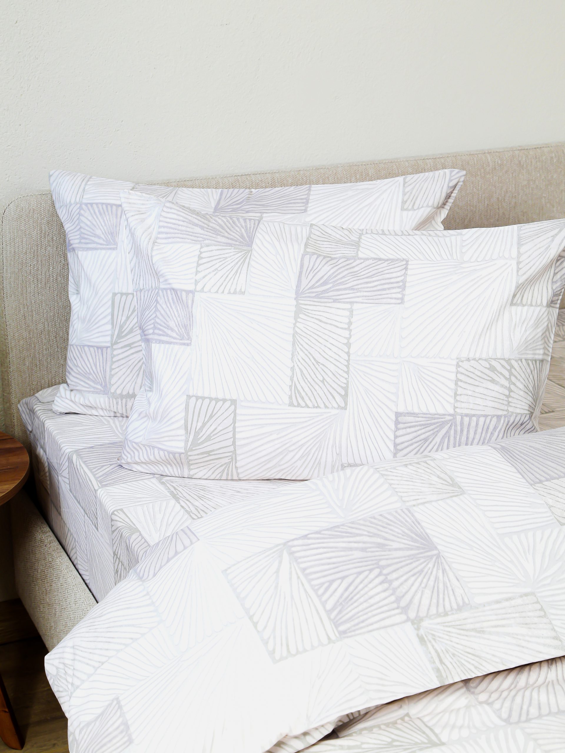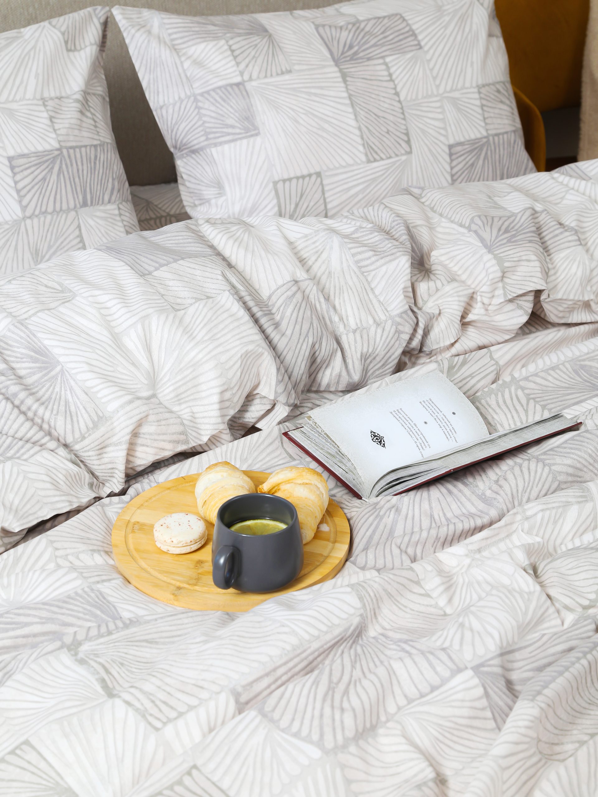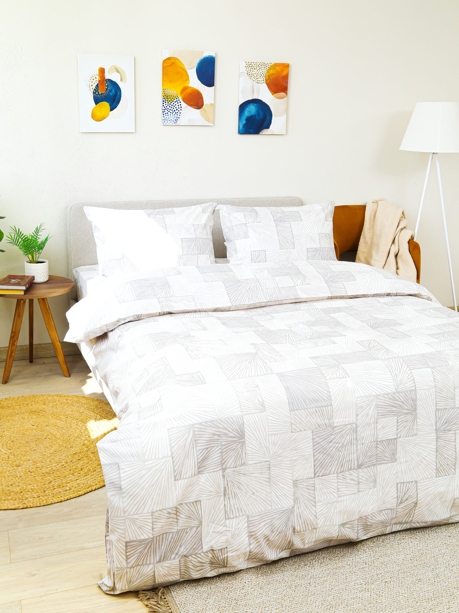 Спокойная бежево-серая геометрия легко сочетается с базовым текстилем и мебелью. Узор немаркий — на нём меньше заметны следы и складки, кровать выглядит опрятно.
